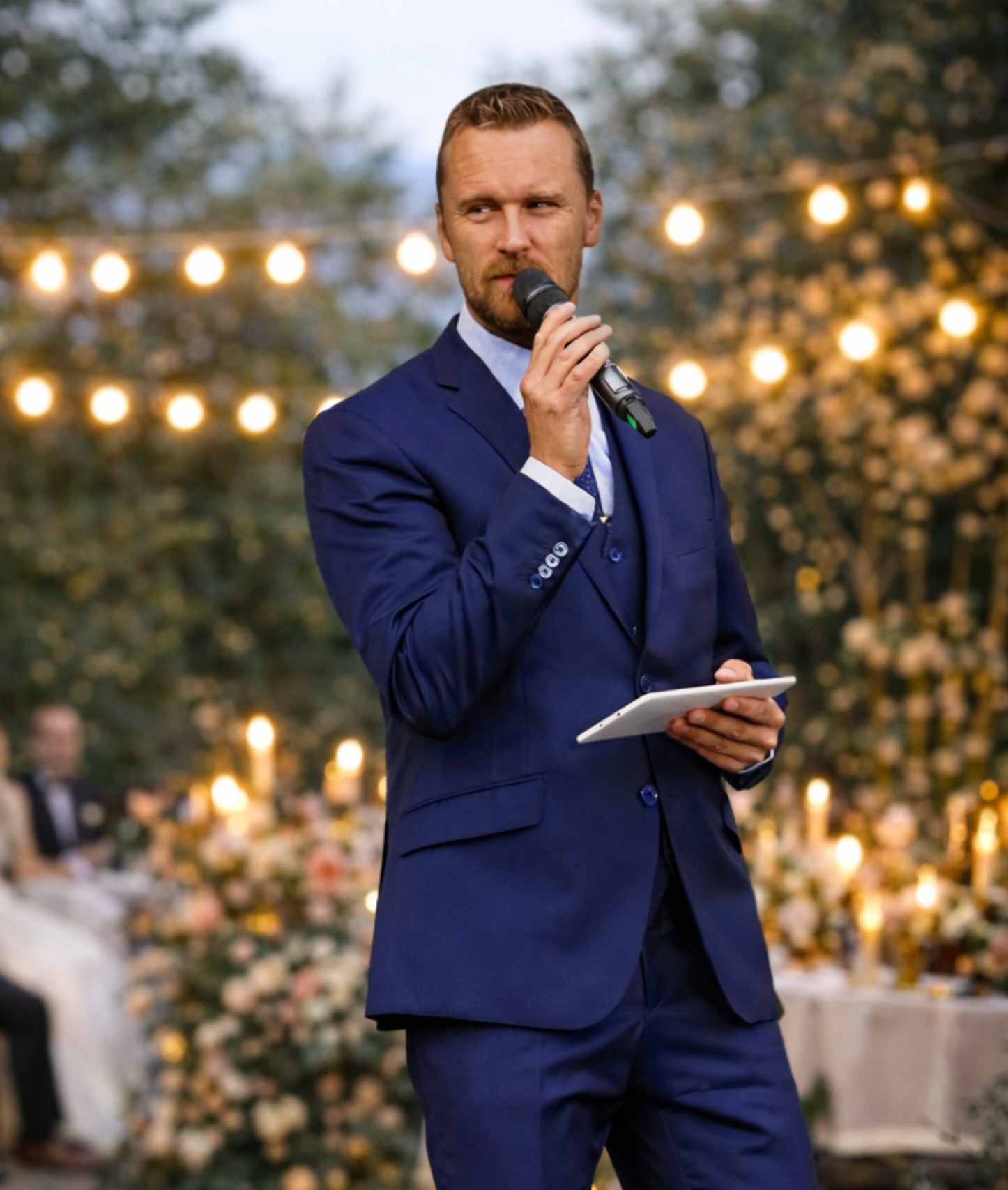 Zkušené vedení svatebního dne, přirozená komunikace s hosty. Profesionální technika a jistota, že vše bude „držet“ od první chvíle.